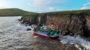 Fourteen crew were airlifted from the 28 m trawler Fastnet after it grounded near Dingle. Tow attempts failed, and authorities said monitoring continues after diesel traces were reported.
