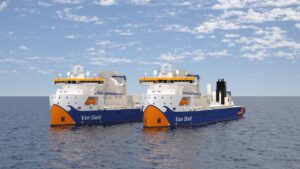 CIMC Raffles signed a second SRI newbuild with Van Oord. The BV-classed 199 m DP2 vessel uses biofuel/methanol engines and a battery-backed DC grid to cut CO₂.