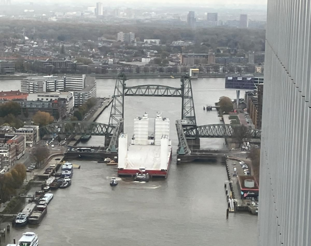 Heavy lift barge BOABARGE 38 passed beneath Rotterdam’s historic De Hef bridge without difficulty. Oudkerk B.V. coordinated the arrival with support from tugs operated by Muller Dordrecht and partners.
