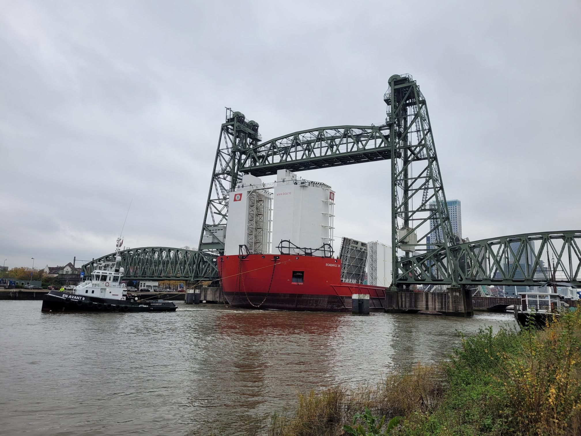 It’s always quite a sight when large vessels manage to slip under a bridge — and this time was no exception. The heavy lift barge BOABARGE 38 made its way through Rotterdam’s historic De Hef railway bridge without difficulty, despite her impressive dimensions of 152 × 38 metres.