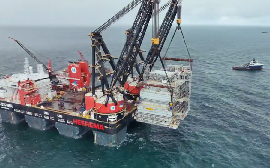 The 10,700-tonne topside, built for ScottishPower Renewables, was lifted into position by Heerema Marine Contractors’ heavy-lift vessel Sleipnir. The structure stands seven storeys high and is part of the transmission system that will connect the 1.4 GW offshore wind farm to the onshore grid.