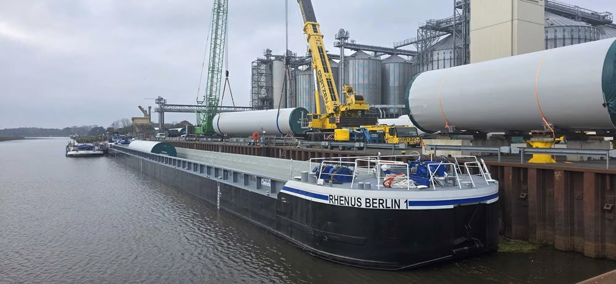 ENERCON has completed its first inland waterway transport of tower sections using the modular push barge Rhenus Berlin I, moving components from the Port of Emden to Haren/Emsland before onward road delivery to a wind farm site.
