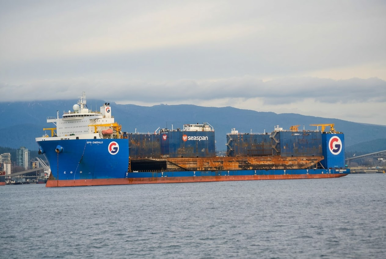 Seaspan Careen was loaded onto GPO Emerald in Vancouver Harbour and is scheduled to sail to Indonesia for upgrades, including bottom reinforcement to lift larger and heavier ships.