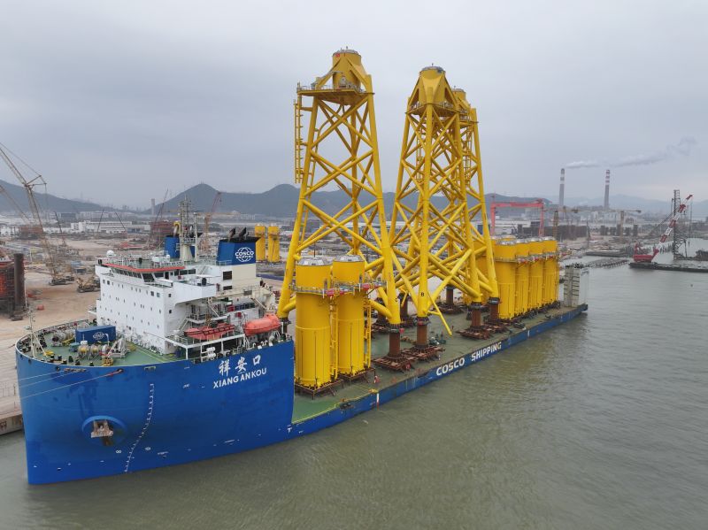 COSCO Shipping’s semi-submersible heavy transport vessel XIANG AN KOU is underway on a China–UK offshore wind logistics run, carrying the second batch of foundation components for the Inch Cape Offshore Wind Farm.
